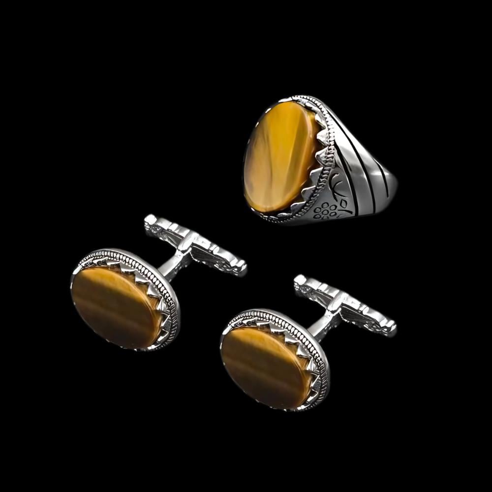 خاتم فضة رجالي مع كبكات فضة عيار 925 بتصميم فاخر ومميز، مزين بحجر عين النمر الذي يضفي لمسة من الفخامة. مما يجعله الخيار المثالي للإطلالات اليومية والمناسبات الخاصة. متوفر بمقاسات متعددة لتناسب كافة الأذواق، ويتميز بجودة عالية تضمن الحفاظ على لون الفضة كما هو دون تغيير. مثالي كهدية فاخرة للرجل العصري